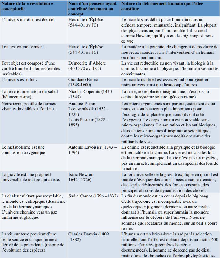 Les révolutions conceptuelles présentées au tableau suivant sont plus que de simples idées. Ce ne sont pas des hypothèses. Ce sont des idées complexes à très grande portée, c’est-à-dire qui expliquent de très grands ensembles de phénomènes et de données. Ce sont des théories qui ont été amplement testées, pour lesquelles on a trouvé une grande diversité d’appuis empiriques, qui jusqu’à maintenant ne souffrent d’aucune contre-démonstration, et qui ont atteint le statut de « paradigmes » scientifiques. Plus concrètement, aucun candidat au doctorat en sciences à sa soutenance de thèse ne pourrait nier une de ces affirmations sans devoir faire face à un débat d’idées au cours duquel il risquerait fort de se faire écraser intellectuellement et couler son diplôme (à moins de mobiliser une contre-démonstration magistrale). Les idées de notre tableau qui suit font partie des idées maîtresses des scientifiques auxquelles ils adhèrent, tout en gardant tout de même l’esprit ouvert à des contre-démonstrations. Ces idées sont directement et inexorablement incompatibles avec les révélations des religions. Elles les contredisent en leur cœur. Voilà sans doute la principale raison pourquoi les scientifiques les plus érudits, les plus engagés sont presque tous athées. Selon Dawkins, dans son God delusion, on a trouvé aucun récipiendaire vivant du prix Nobel qui croyait à un Dieu personnel, aucun qui ne croyait à une révélation religieuse.