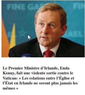 - Juillet 2011 – Le Premier Ministre d’Irlande, Enda Kenny, fait une violente sortie contre le Vatican: « Les relations entre l’Église et l’état en Irlande ne seront plus jamais les mêmes ».