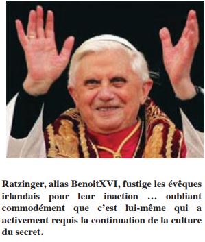- Devant l’ampleur prise par le scandale Irlandais, en février 2010, Ratzinger, alias Benoit XVI, fustige les évêques irlandais pour leur inaction … oubliant commodément que c’est lui-même qui a activement requis la continuation de la culture du secret.