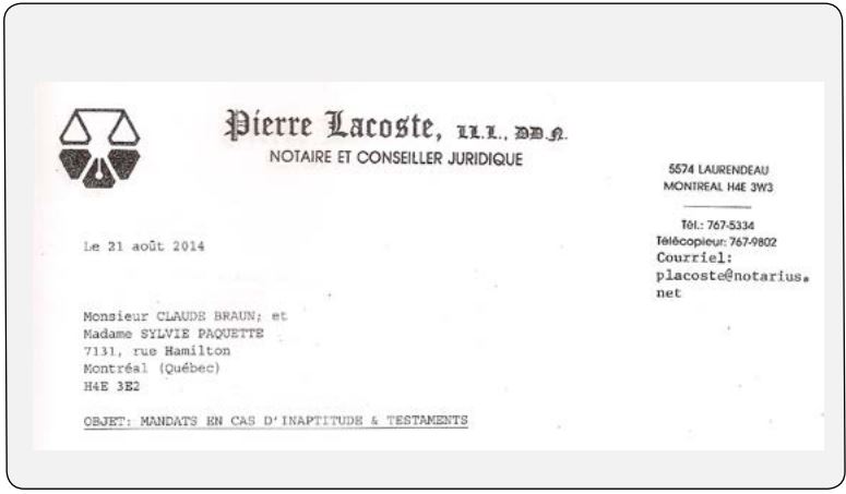 NDLR La moyenne d’âge des membres des associations humanistes à travers le monde est sans doute assez élevée. N’estce pas après avoir absorbé les vicissitudes de la vie qu’on devient plus sage ? Quoiqu’il en soit, et même si nous voudrions ardemment remplir notre membership de très jeunes gens, tirons profit tout de même de la situation dans laquelle nous sommes. Faisons un legs testamentaire à l’AHQ. Si vous l’avez déjà fait, laissez-nous le savoir. Si vous prévoyez rédiger un testament ou le modifier, en y prévoyant un legs à l’AHQ, laissez-nous le savoir. Je reproduis ici le frontispice de mon propre testament en exemple, sans les détails. Un legs à l’AHQ s’y trouve. Notez que ce notaire en particulier m’a impressionné par sa compréhension détaillée des besoins des humanistes en matière de non-acharnement thérapeutique, souhaits de fin de vie, mandats d’inaptitude, mourir dans la dignité, etc. Claude Braun