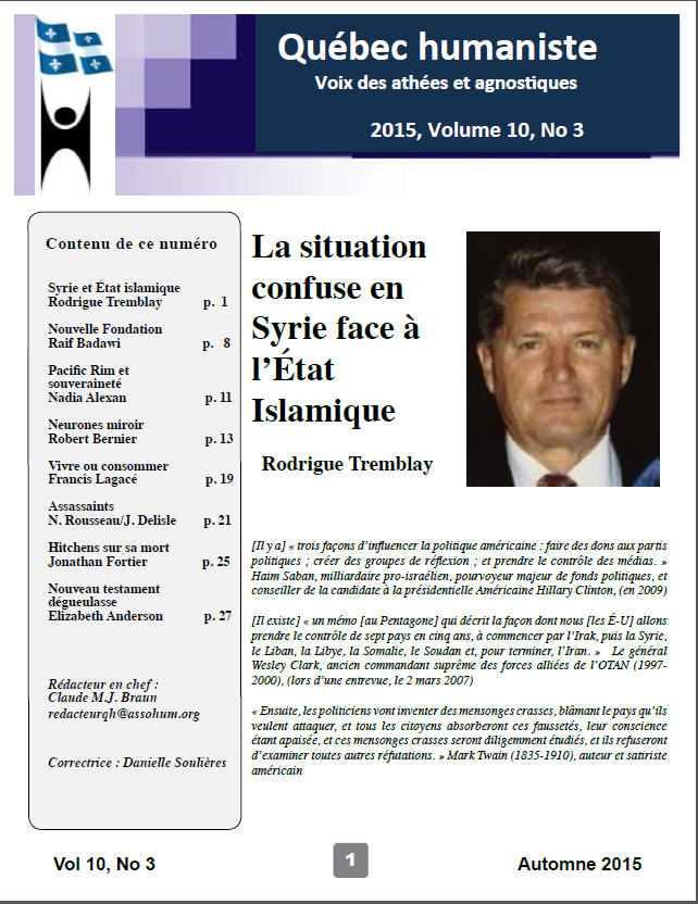 humaniste, du film Torture made in USA – Chantal Tittley - -Compte rendu de lecture du livre de Louise Mailloux “La laïcité, ça s’impose !” – Andrée Deveault